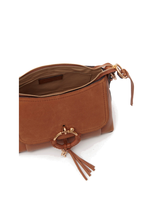 Μικρή τσάντα Joan χιαστί με φερμουάρ σε εκλεπτυσμένο συνδυασμό από κόκκους και σουέντ δέρμα αγελάδας με διπλά λουριά. Η ευρύχωρη εσωτερική θήκη και η μπροστινή θήκη το καθιστούν μια κομψή τσάντα ημέρας. Ένα μεγάλο θηλυκό πλεγμένο δαχτυλίδι, με την υπογραφή See By Chloé.